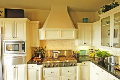 333-S Raised Panel Worn Champagne on Paintgrade Kitchen with Custom Hood